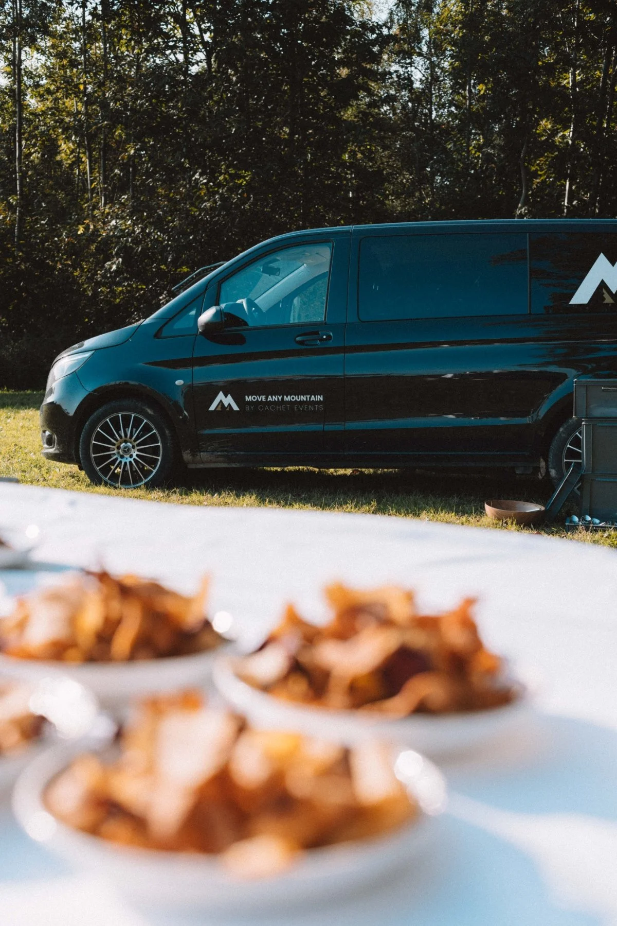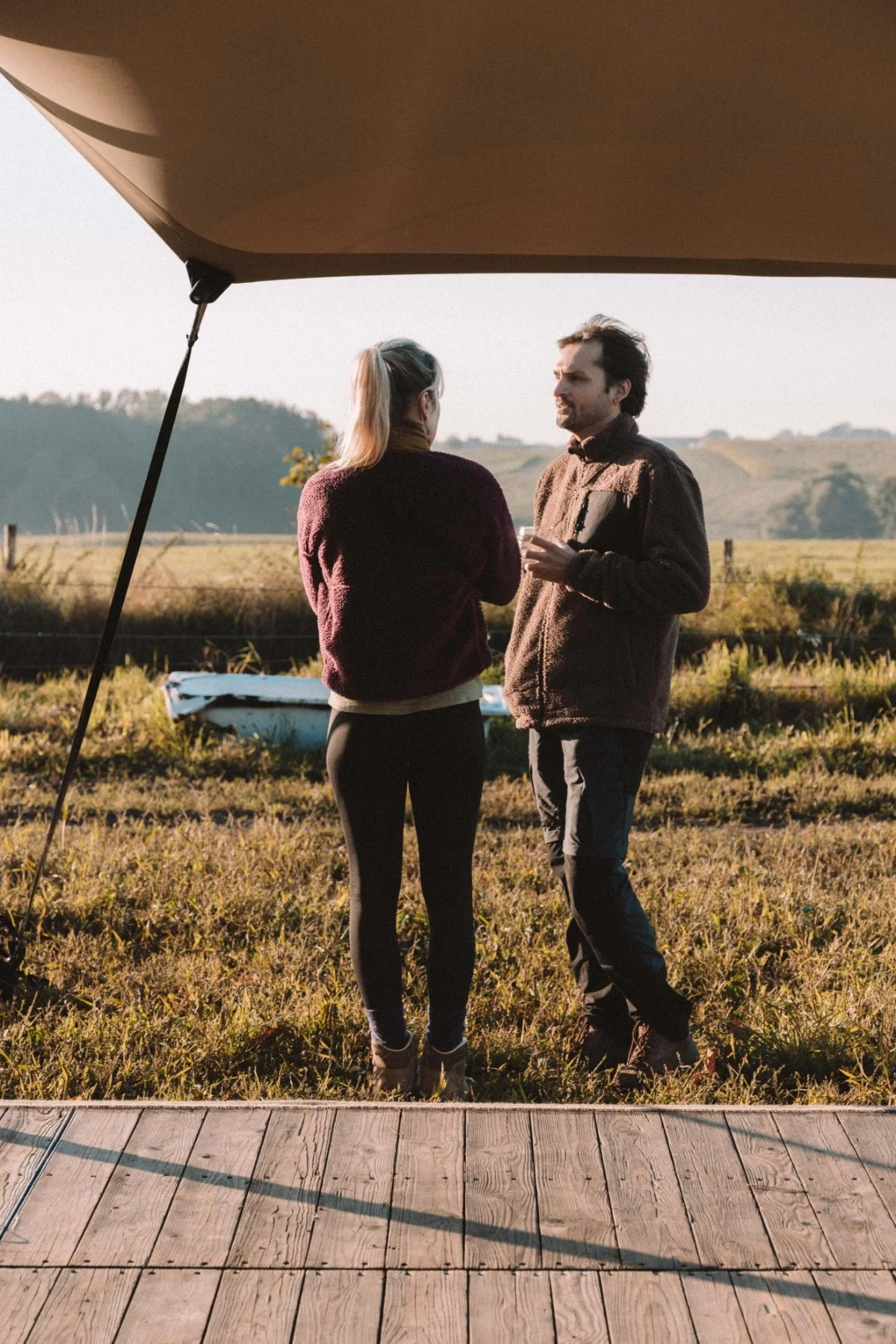 We chose a stunning meadow in the Flemish Ardennes, surrounded by rolling hills, forests, and fields โ with nothing else in sight. At its centre: a stretch tent, fire pits, cosy lounge corners, a long dining table beneath tall trees, and a pop-up kitchen.